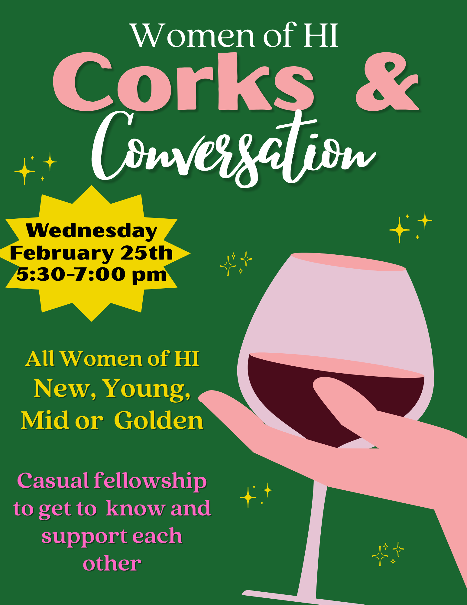 Women of HI are invited to gather for an evening of relaxed conversation and connection at Corks & Conversation. Join us on Wednesday, February 25, from 5:30–7:00 PM for a casual time to unwind, meet new faces, and build meaningful relationships across generations. Whether you’re new to HI or have been here for years, this is a space to connect, laugh, and encourage one another in community.